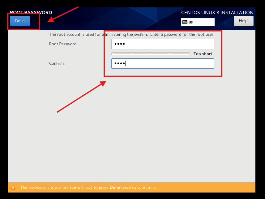 自己用的话,建议就直接 root ,方便好记,完成后点击 Done,密码简单的话需要点击两次 Done