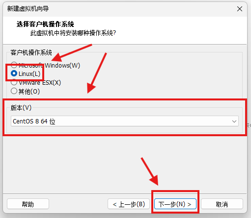 这里操作系统选择 Linux,版本选择 Centos8 64 位,然后下一步