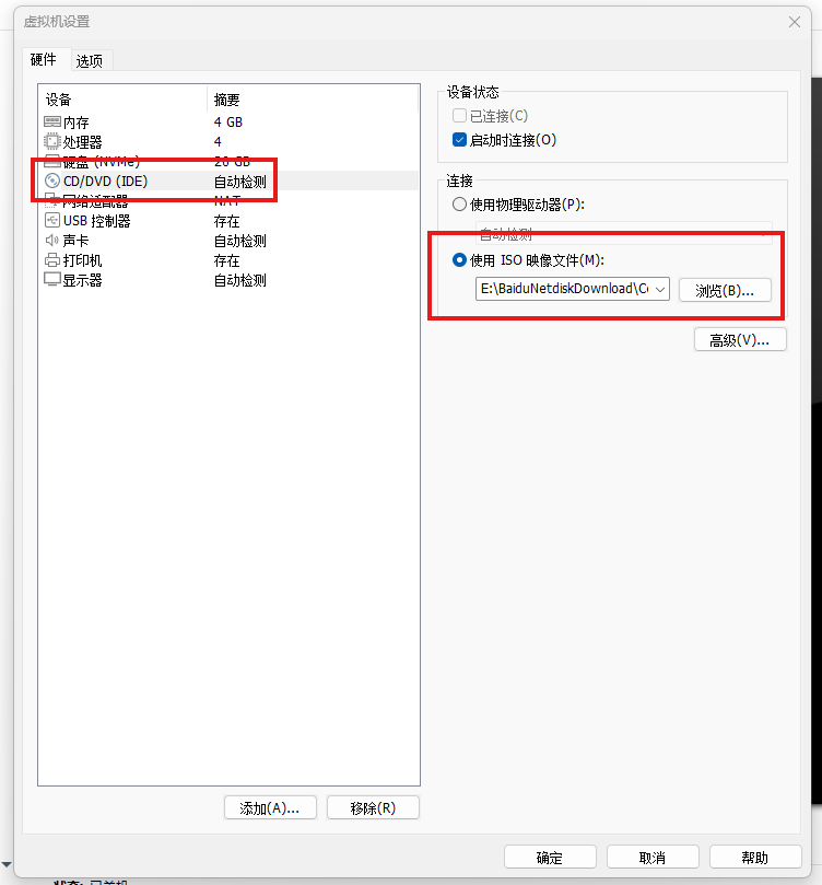 点击CD/DVD(IDE),然后选择使用的ISO映像文件,就是前文提到的 Centos8 ISO 镜像文件,然后点击确定,然后启动虚拟机