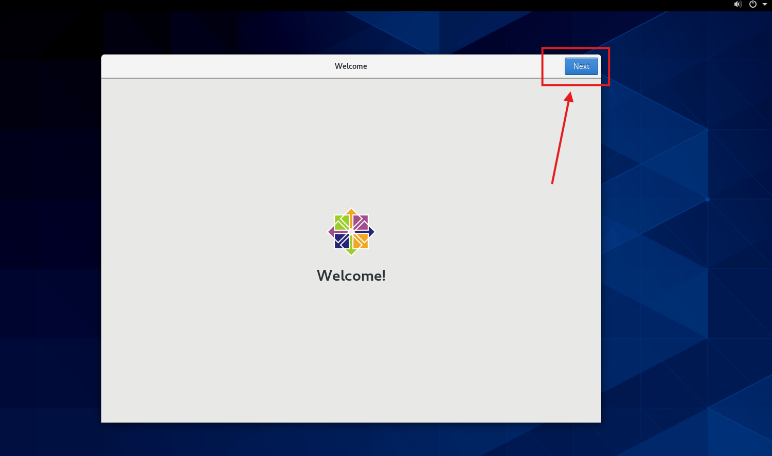 进入 Centos8 欢迎界面,点击 Next(下一步)