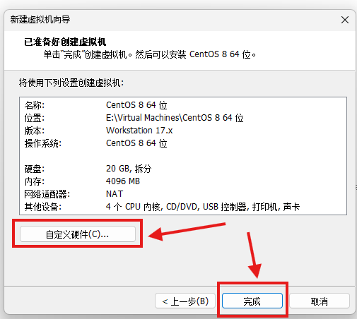 然后就可以完成虚拟机的硬件配置,可以再点开自定义硬件查看一下硬件配置,没问题的话点完成就可以了。