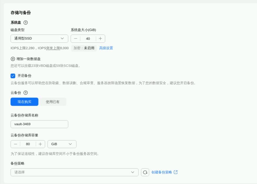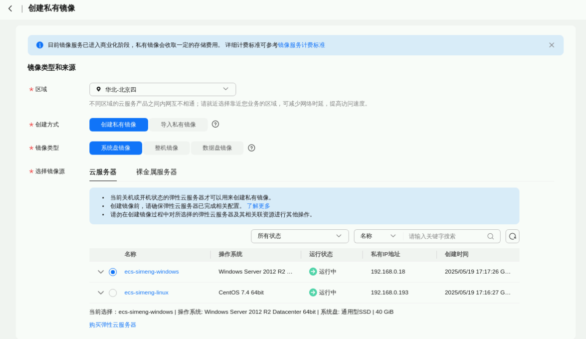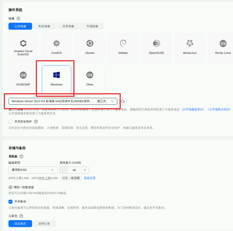 操作系统选择 windows server 2012 r2 标准版64位简体中文,存储默认即可