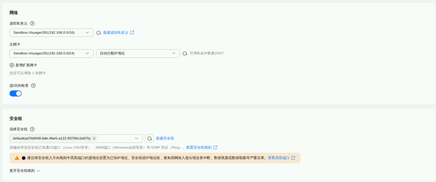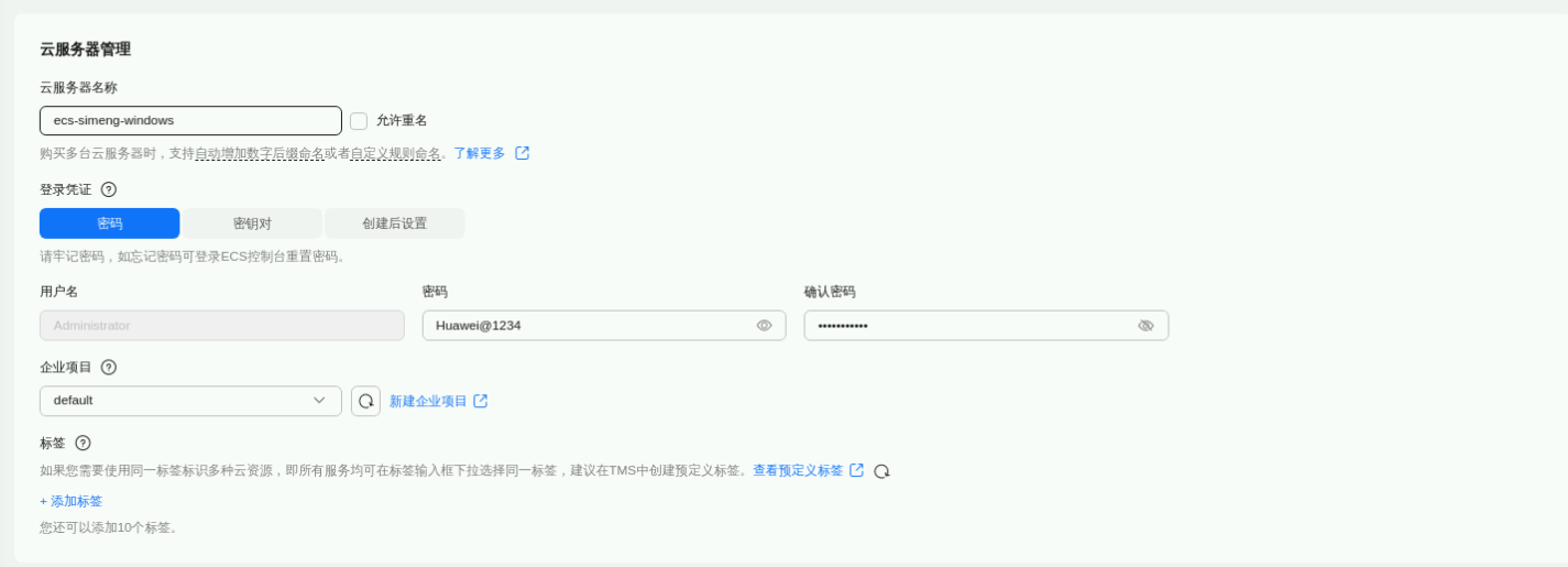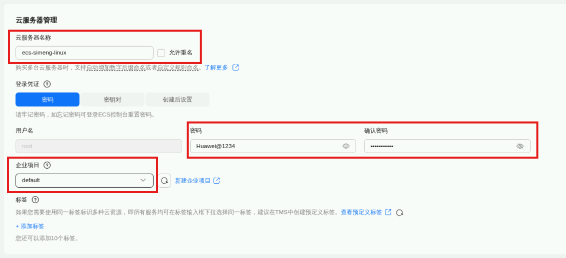 这里配置一下云服务器的名称和 root 用户的密码,这个企业项目也要填,直接 default 即可
