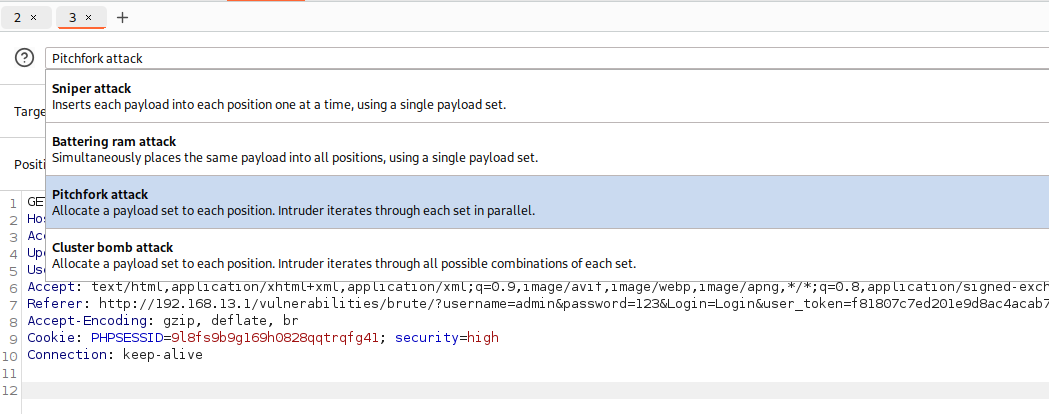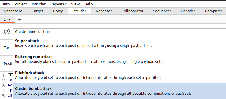 右键将请求放到轰炸机( Intruder )中,选择 Cluster bomb attack 模式