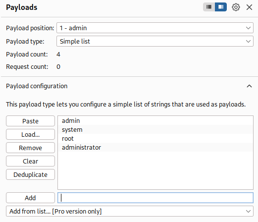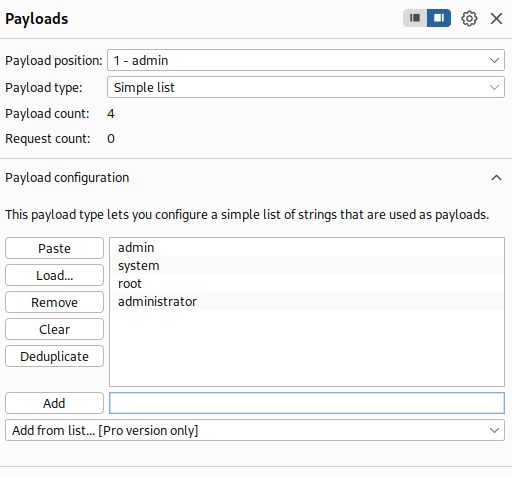 在载荷(Payloads)中,第一个是用户名,添加一些常见的用户名