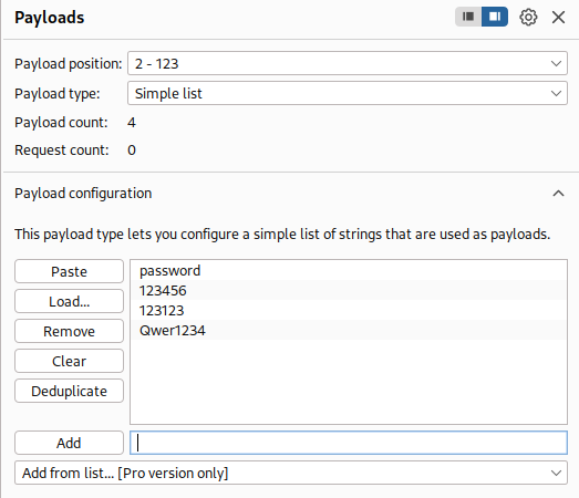 密码部分添加一些常见的密码,也可以直接使用密码本,Kali Linux 中的密码本可以参考:【kali笔记】kali中常用的密码字典,网站推荐 | CN-SEC 中文网