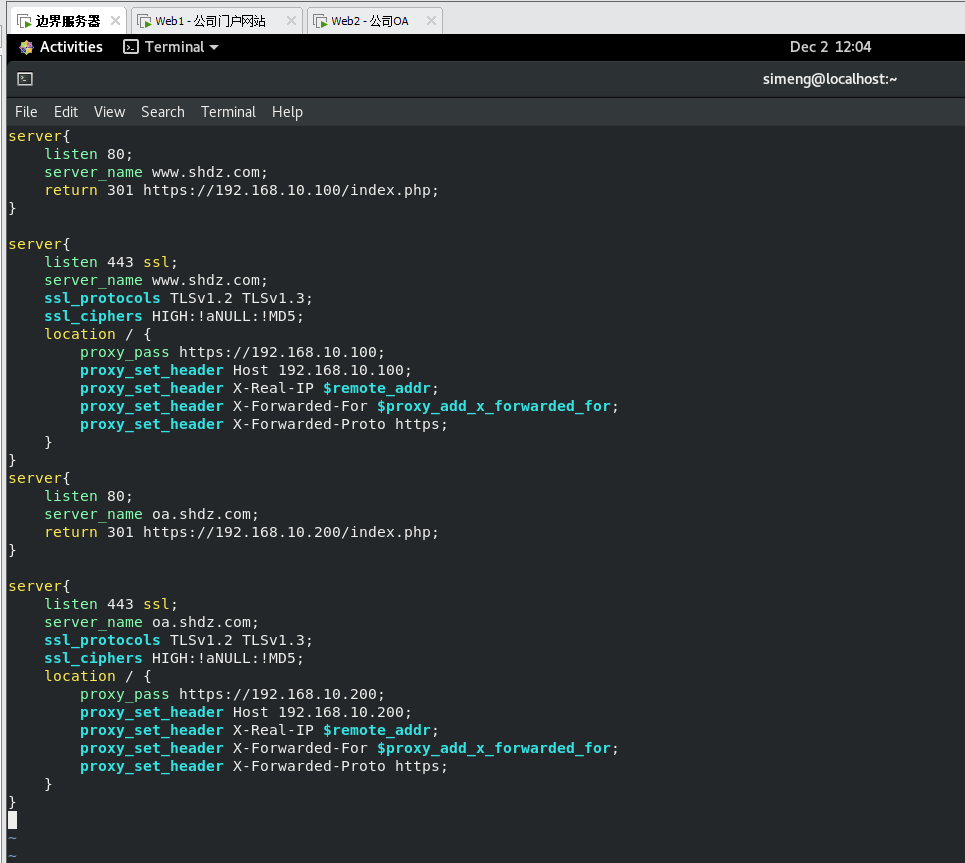 a、在边界服务器上配置https服务,并且配置反向代理,分别实现对内网两台web服务器的访问。(10分)
