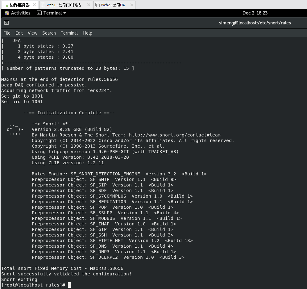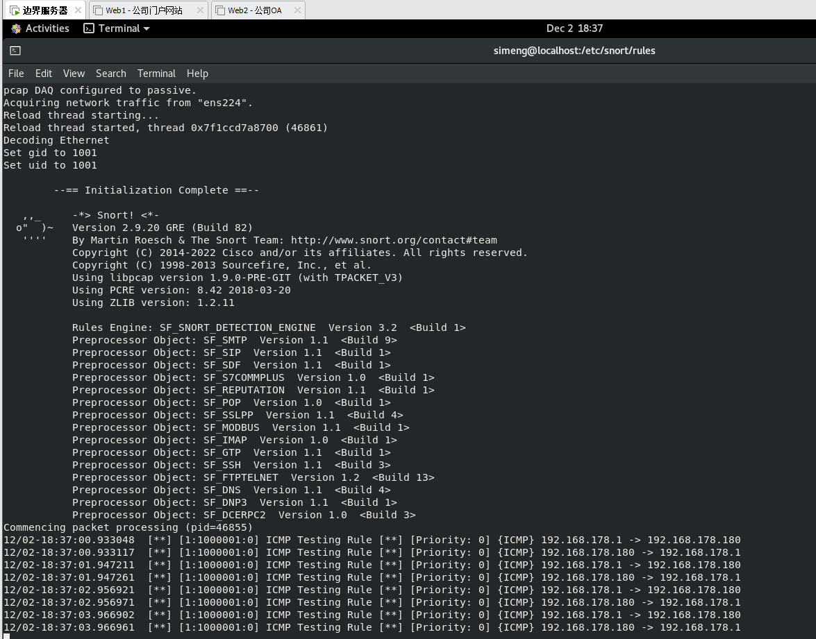 命令:snort -T -i ens224 -u snort -g snort -c /etc/snort/snort.conf