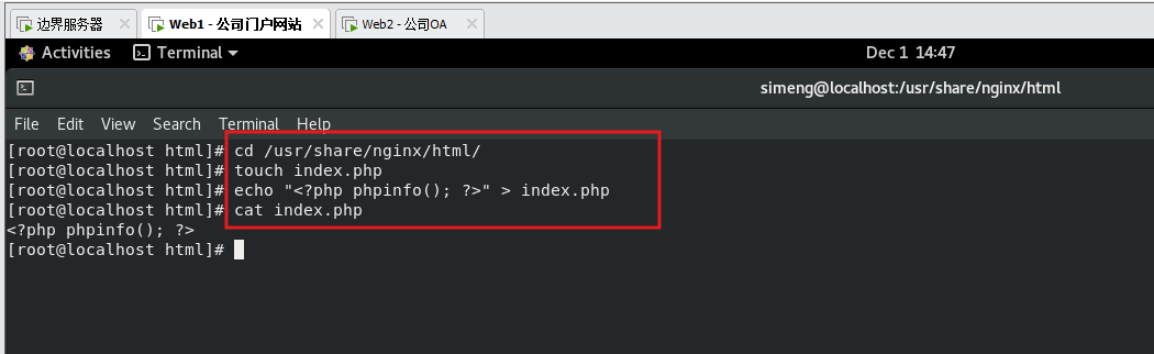 b、 两台内网服务器分别部署LNMP,部署完成后,分别在/var/www/html目录下创建一个index.php文件,在使用网页访问时,分别输出的内容为: