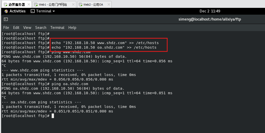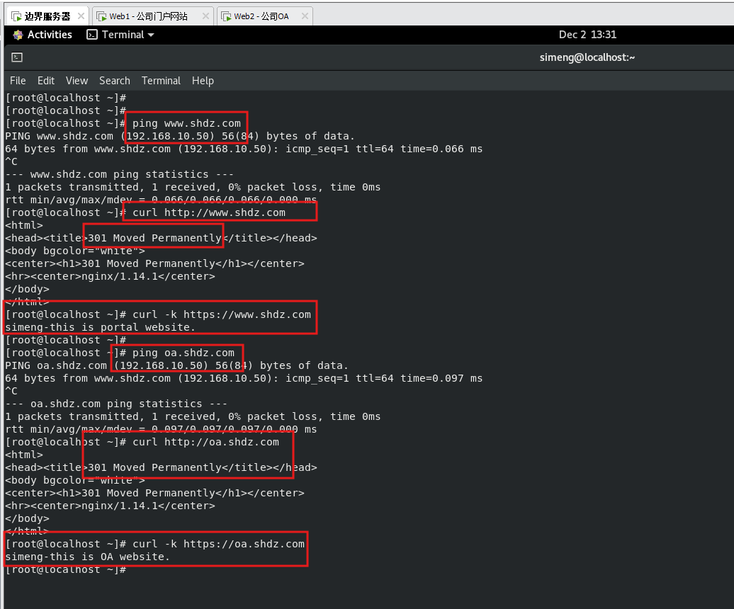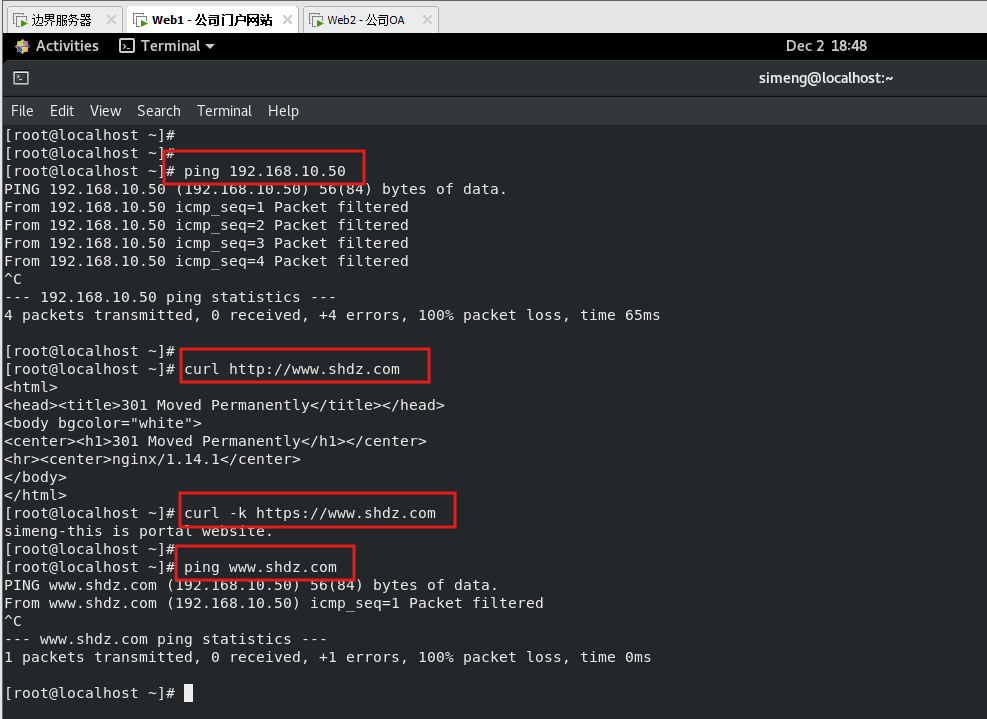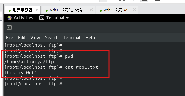 结论:边界服务器可以 ping 通 Web1 和 Web2