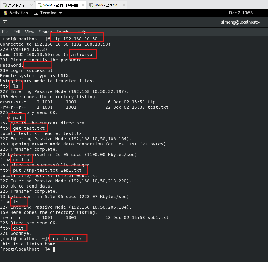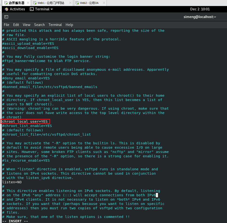 c、 在边界服务器上部署FTP服务,设置FTP的访问用户为:姓名全拼,将访问用户限制在自己的家目录,在家目录下创建一个FTP目录,将其属主和属组都修改为所创建的用户名,最后在FTP目录下,创建一个test.txt文件。(5分)