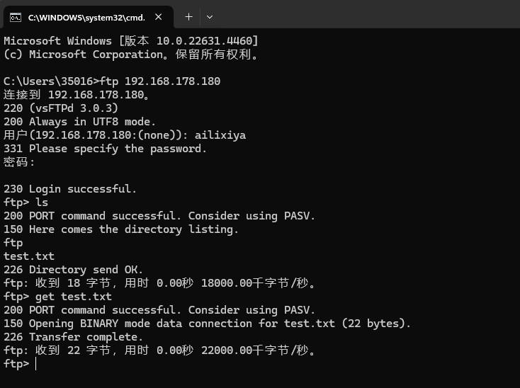 b、 在物理主机访问边界器上的FTP服务,并下载test.txt文件(5分)