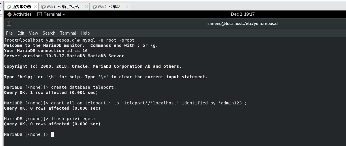 grant all on teleport.* to 'teleport'@'localhost' identified by 'admin123';