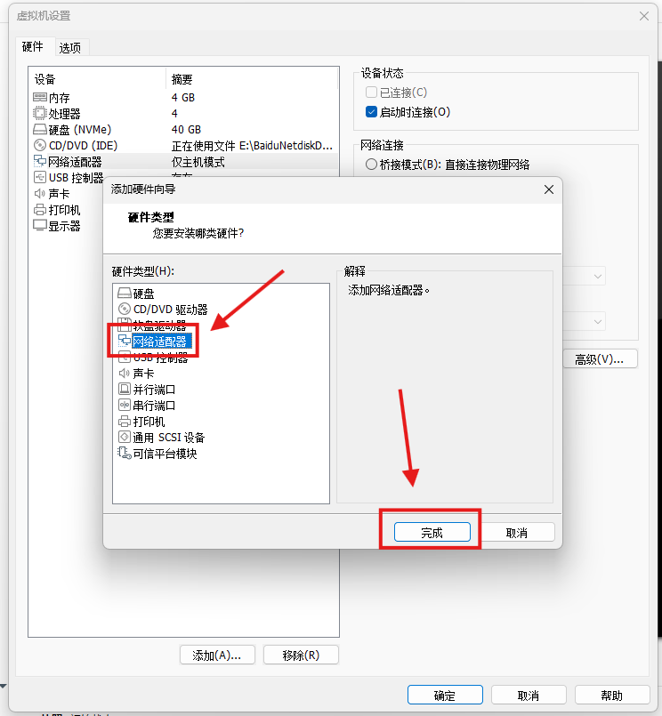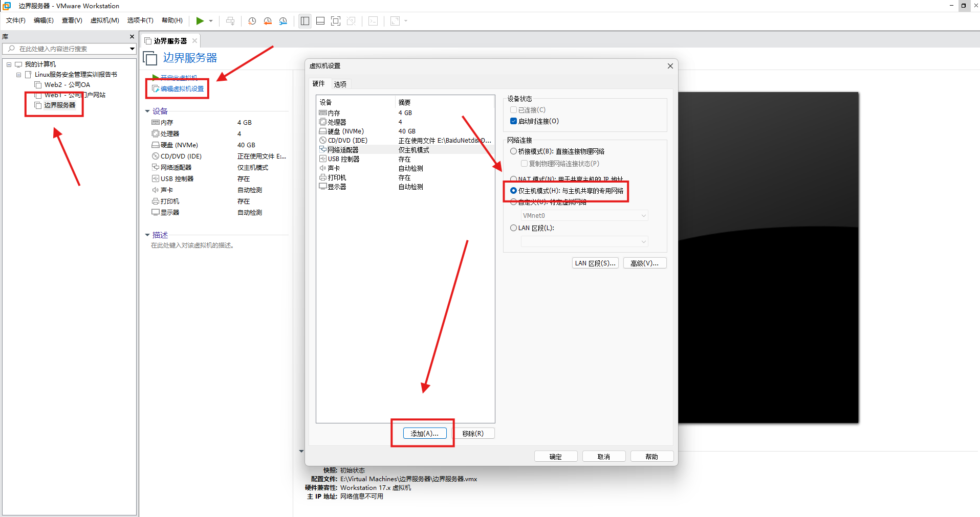 创建完三个对应的虚拟机之后,选择边界服务器,点击“编辑虚拟机设置”,点击“网络适配器”,配置为“仅主机模式”,然后点击添加。