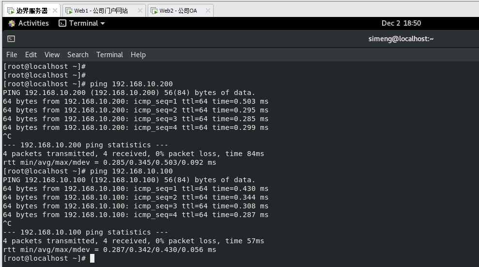 配置完成之后,边界服务器既可以 ping 通百度,也可以 ping 通两个 Web 服务器。