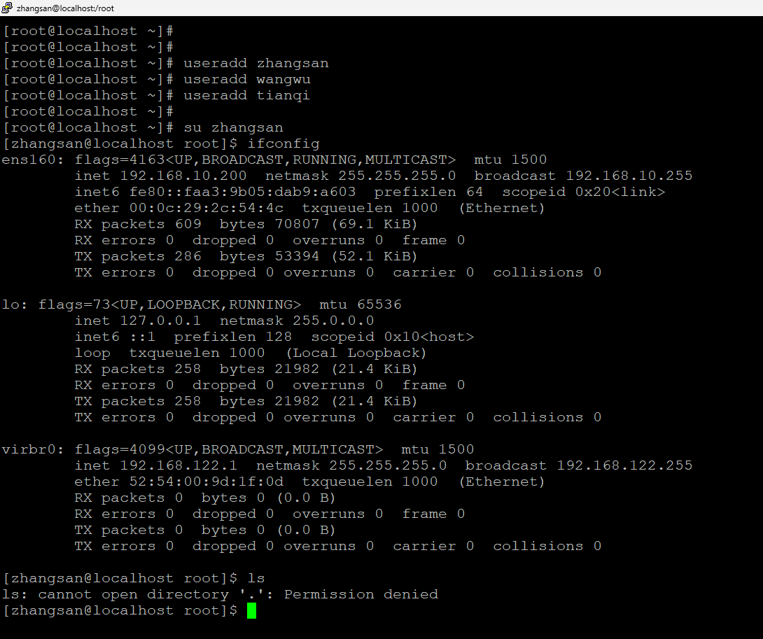 useradd tianqi验证,有图可得,zhangsan只能使用 ifconfig,无法使用 ls 命令,其他用户同理。