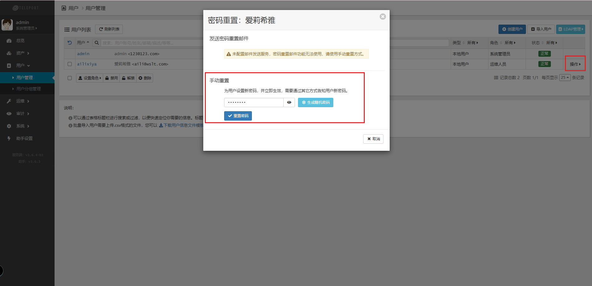 点击用户最右边的操作->重置密码,给爱莉希雅设置密码