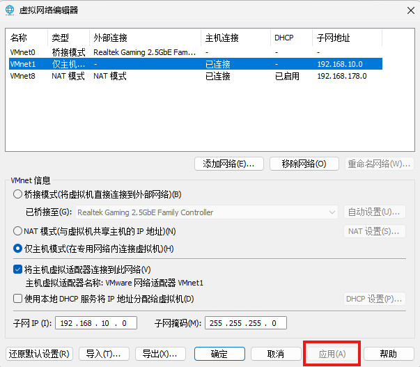 修改VMnet1的子网IP地址范围为 192.168.10.0,子网掩码为 255.255.255.0,然后点击应用即可。