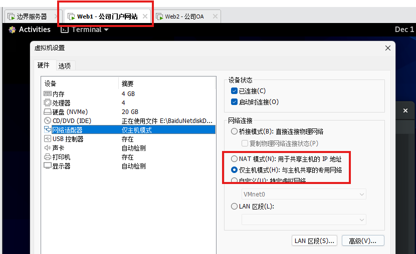 边界服务器有两张网卡,请设置仅主机模式的那张网卡,可以先点击虚拟机->右键设置->硬件->网络适配器,点击高级,里面可以查看到这张网卡的MAC地址,然后根据MAC地址来修改网卡的IP地址。